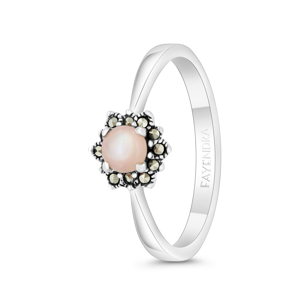 Total Weight: 2.1gShine with this Fayendra ring crafted from 925 sterling silver, featuring a natural pink Mother of Pearl stone with a soft pearly glow that reflects refined femininity, delicately surrounded by sparkling marcasite stones adding a vintage-inspired elegance and highlighting exquisite craftsmanship, a timeless piece perfect for graceful everyday wear or a sophisticated meaningful gift, shop it now!