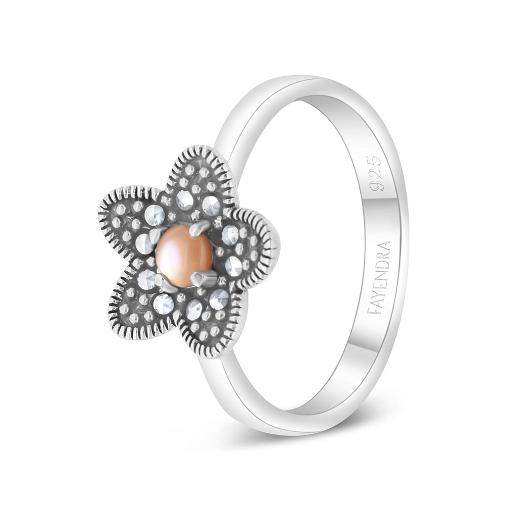Sterling Silver 925 Ring Embedded With Natural Pink Shell And Marcasite Stones