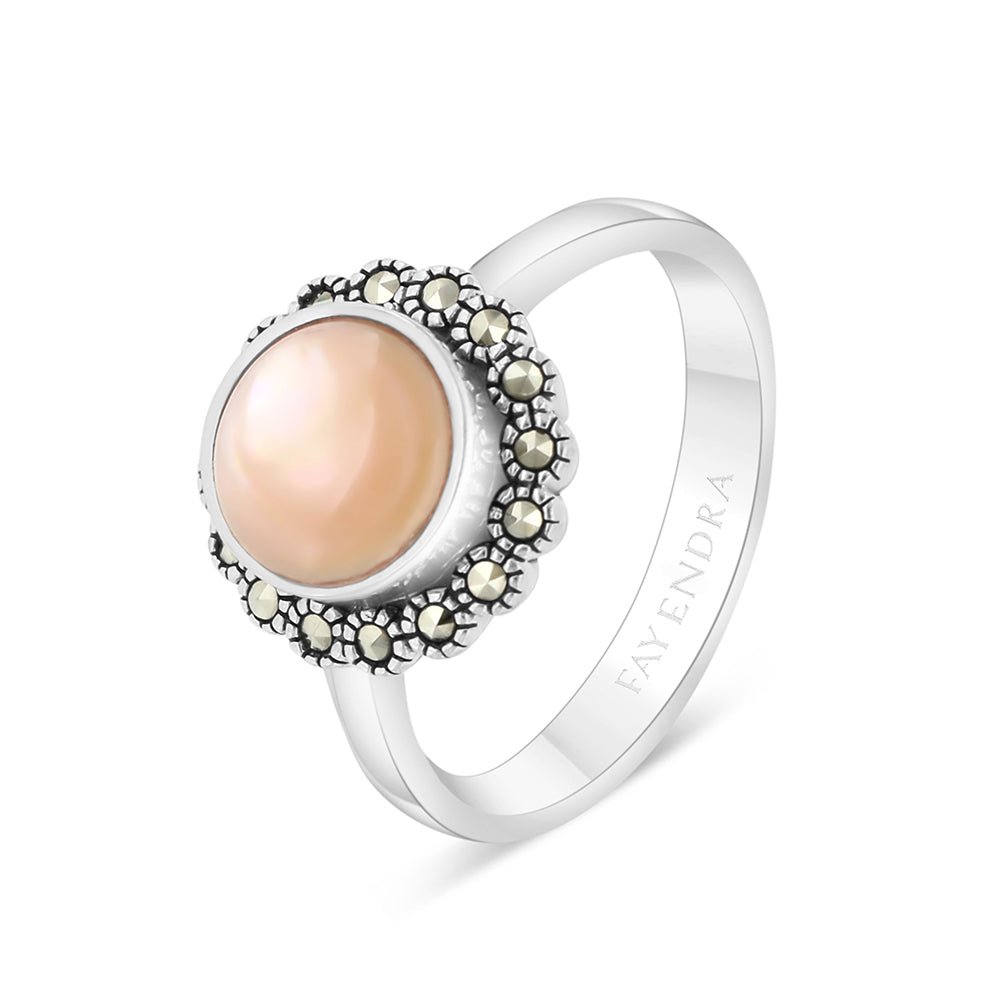 Sterling Silver 925 Ring Embedded With Natural Pink Shell And Marcasite Stones