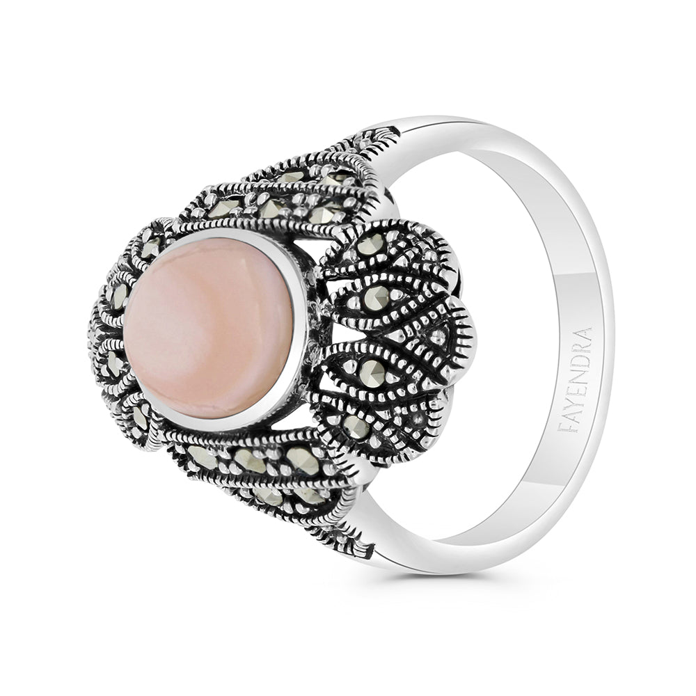 Total weight: 6gFeel glamorous and regal with this classic ring from Fayendra. The elegant ring is made of 925 sterling silver and adorned with pink shell stone and marcasite.