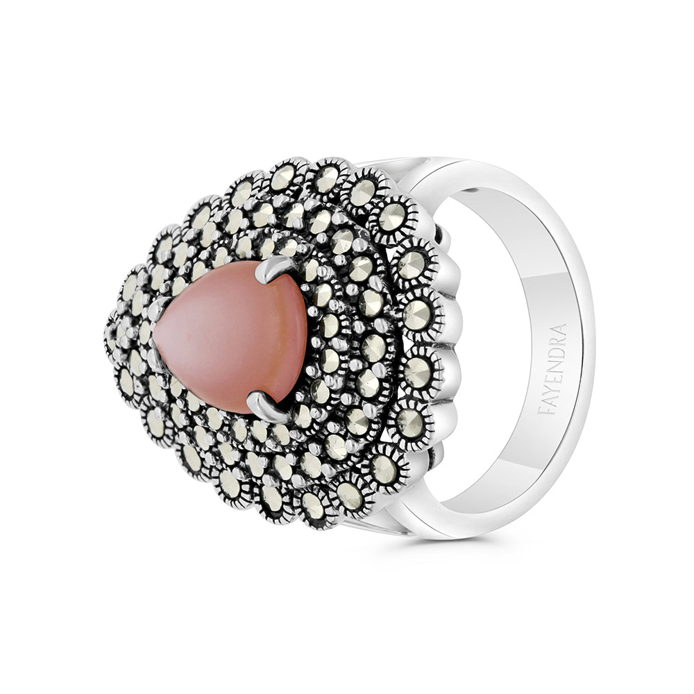 Total weight: 10gTo enhance the allure of this classic ring, delicate Marcasite stones are intricately embedded around the pink shell stone.The striking contrast between the shimmering Marcasite and the deep, mysterious beauty of the natural shell creates a mesmerizing visual effect that will surely turn heads and spark conversations.