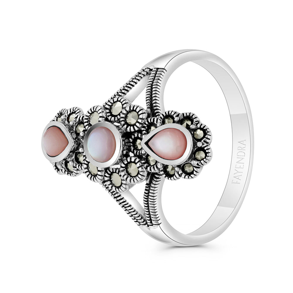 Total weight: 3.7gAdorn yourself with this dainty 925 sterling silver ring from our classic collection. The elegant ring is adorned with 3 central pink shell stones one in a round cut and two in tear cut alongside shiny marcasite stones.