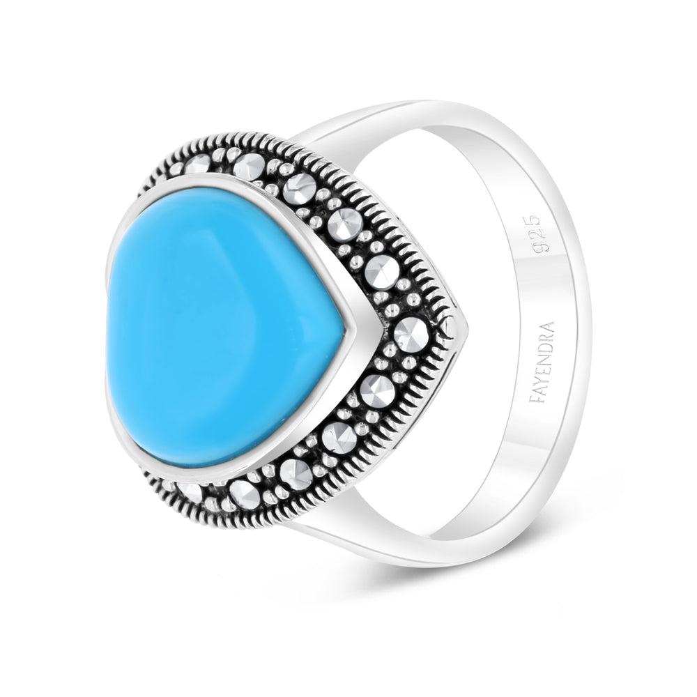 Total weight: 5.7gA classic ring with a contemporary twist, made of 925 sterling silver and set with natural turquoise stone traced with marcasite stones. A sweet and lovely gift for yourself or someone you care about.