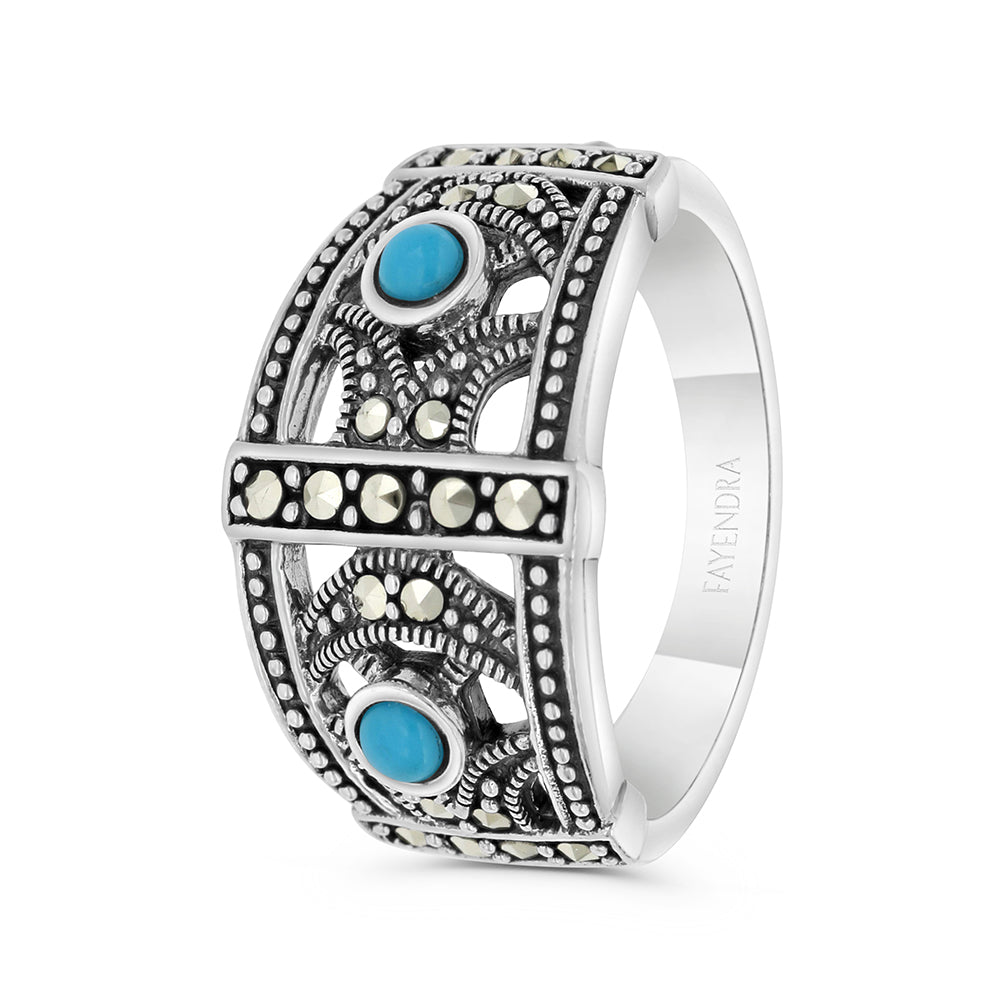 Sterling Silver 925 Ring Embedded With Natural Processed Turquoise And Marcasite Stones