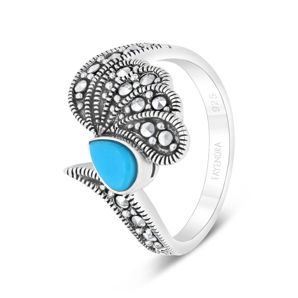 Total weight: 3.8gPeacocks are known for their special beauty, and they symbolize versatility, glamour, and luxury. Our 925 sterling silver fine ring is inspired by peacocks to reflect your love for beauty and sophistication. The silver ring is adorned with natural turquoise stone and shiny pure marcasite. Own the whole set for luxurious jewels that will never fail you.