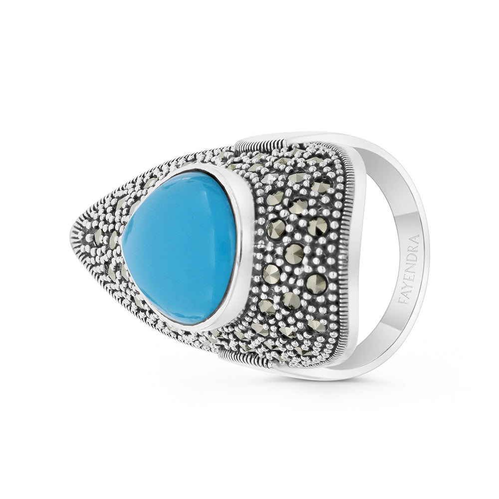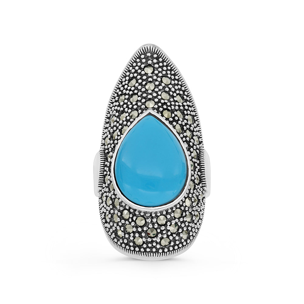 Total weight: 11.69gExpress your unique taste, and your love for quality and classics, with this Fayendra ring of sterling silver, inlaid with marcasite stones scattered all over its metal and a natural turquoise stone in teardrop cut at its center. Coordinate it with your favorite outfit and get a striking look.