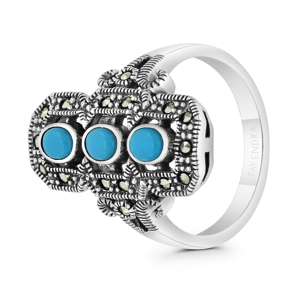 Sterling Silver 925 Ring Embedded With Natural Processed Turquoise And Marcasite Stones