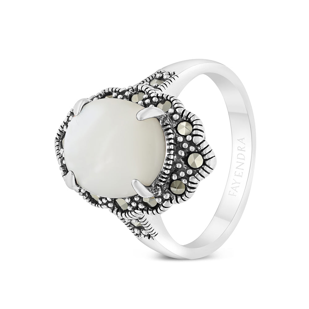 Total weight: 5.5gخاتم في قمة الاناقة والرقي من مجموعة فايندرا الكلاسيكية مصنوع من الفضة الاسترلينية ومزين بقطعة مركزية من حجر الصدف الأبيض الطبيعي المتميز بلمعانه ولونه اللؤلؤي الذي يتغير مع تغير الضوء بفضل طبقته الداخلية عالية التقزح اللوني، يحيط بحجر الصدف الأبيض اطار مرصع بأحجار الماركاسيت الصافية مما يعطي الخاتم لمعة جذابة.