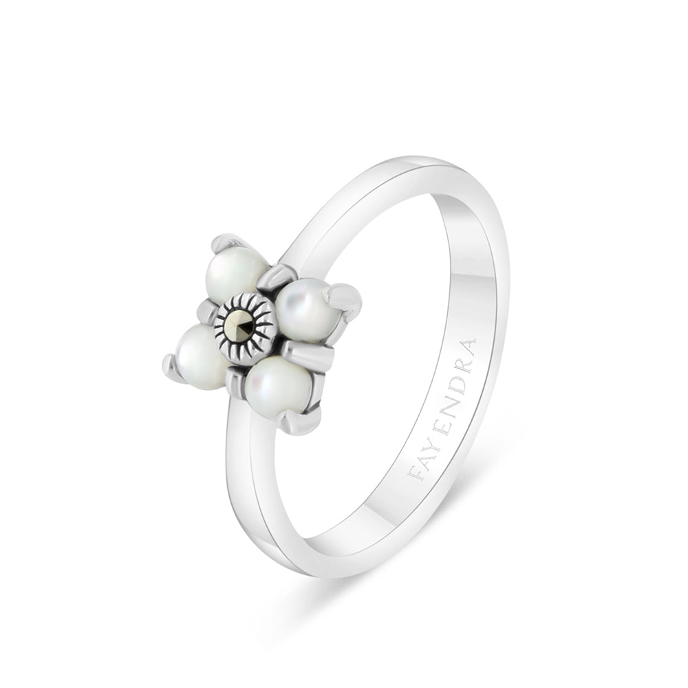 Sterling Silver 925 Ring Embedded With Natural White Shell And Marcasite Stones