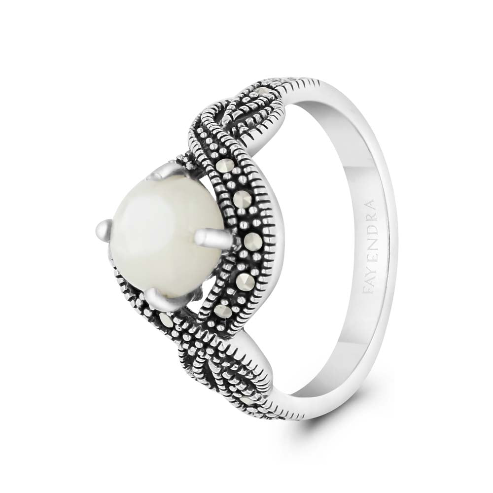 Sterling Silver 925 Ring Embedded With Natural White Shell And Marcasite Stones