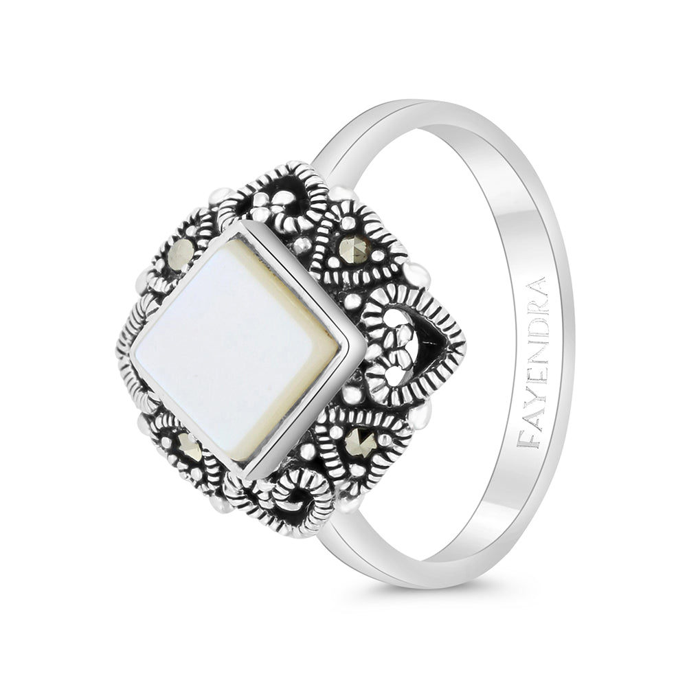 Sterling Silver 925 Ring Embedded With Natural White Shell And Marcasite Stones