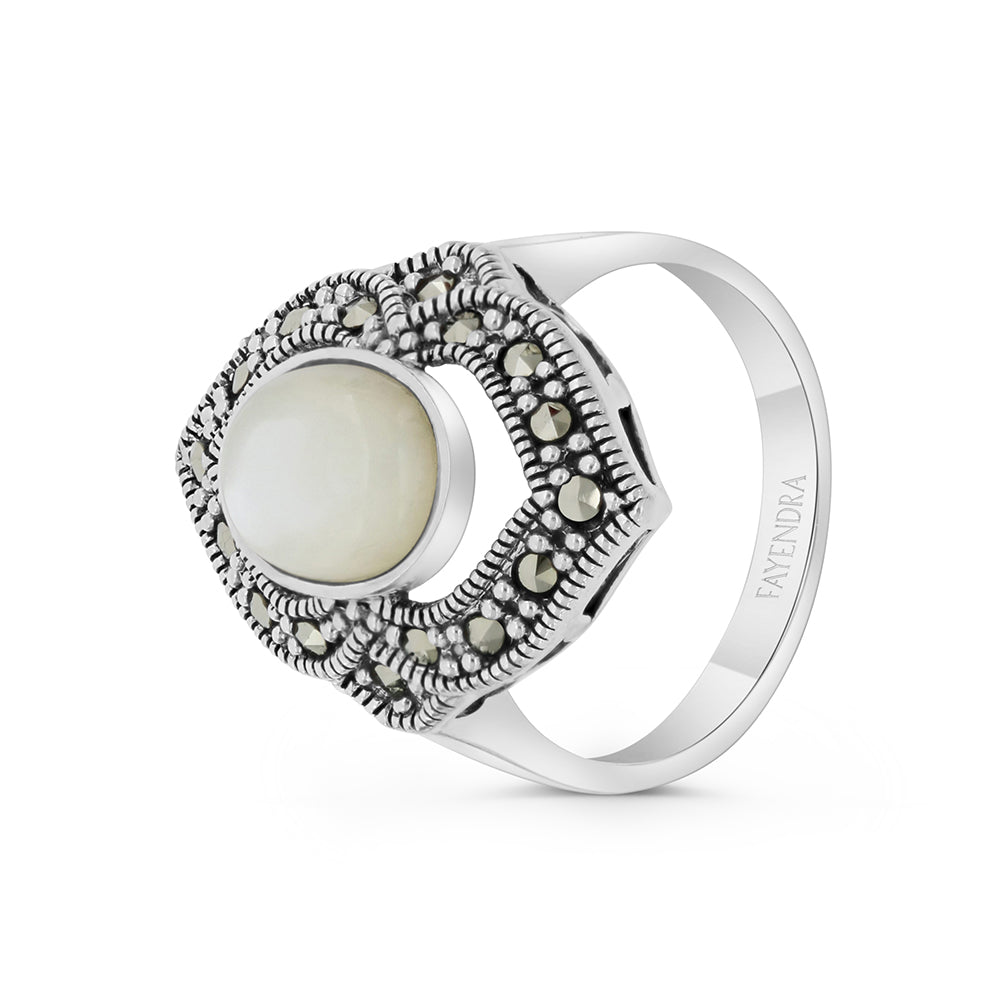 Total weight: 3.9gA luxurious ring with a classic and elegant design from Fayendra. Made of sterling silver, its front metal is studded with shiny marcasite stones, in the middle of the metal is a natural mother-of-pearl stone in a circular cut. A valuable gift for a woman you love and appreciate.