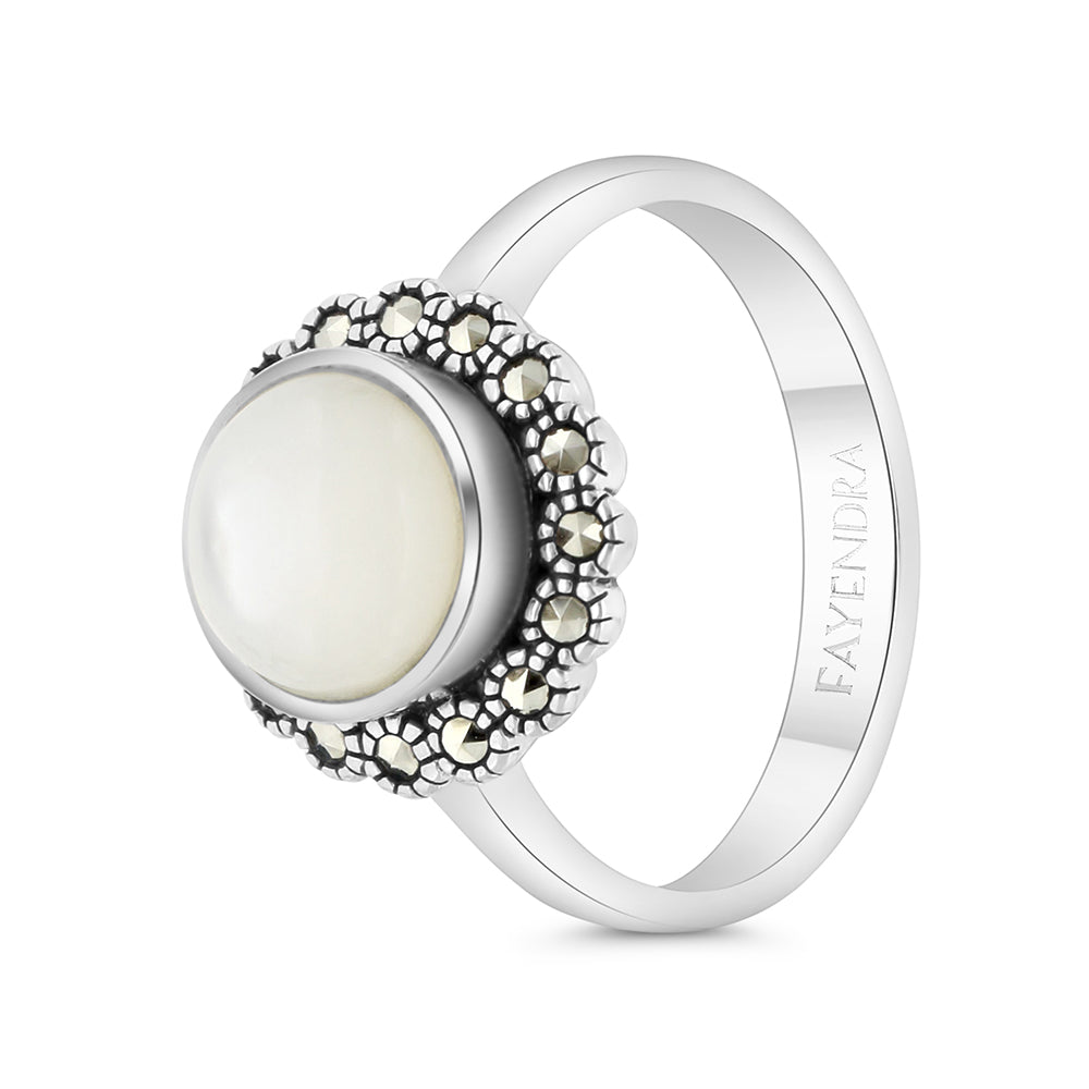 Sterling Silver 925 Ring Embedded With Natural White Shell And Marcasite Stones