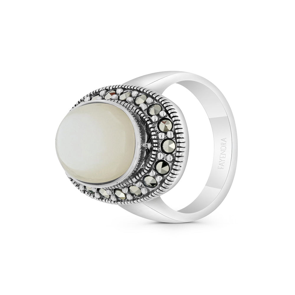 Sterling Silver 925 Ring Embedded With Natural White Shell And Marcasite Stones