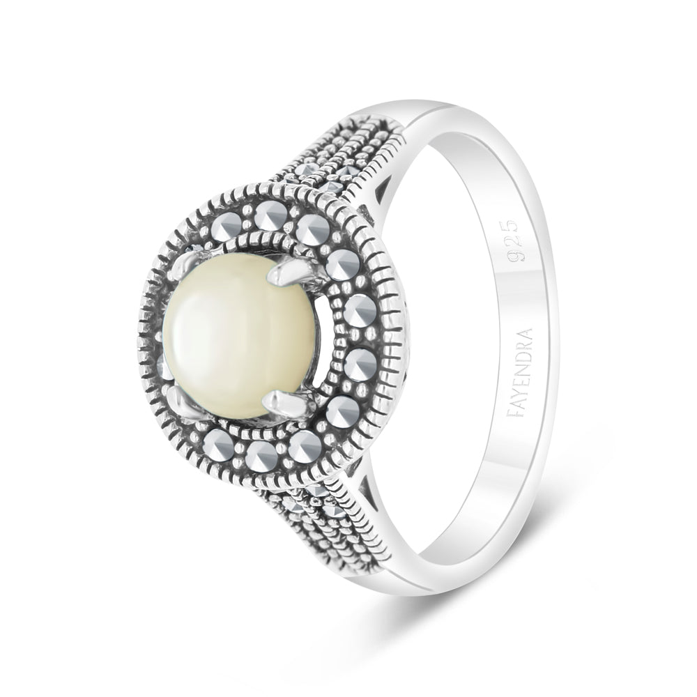 Sterling Silver 925 Ring Embedded With Natural White Shell And Marcasite Stones