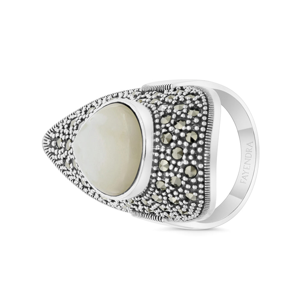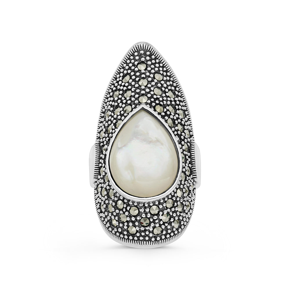 Total weight: 11.69gExpress your unique taste, and your love for quality and classics, with this Fayendra ring of sterling silver, inlaid with marcasite stones scattered all over its metal and a natural mother-of-pearl stone in teardrop cut at its center. Coordinate it with your favorite outfit and get a striking look