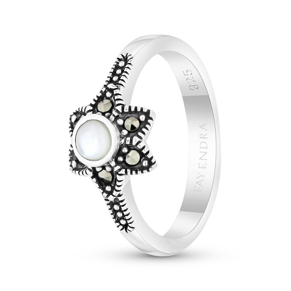 Sterling Silver 925 Ring Embedded With Natural White Shell And Marcasite Stones