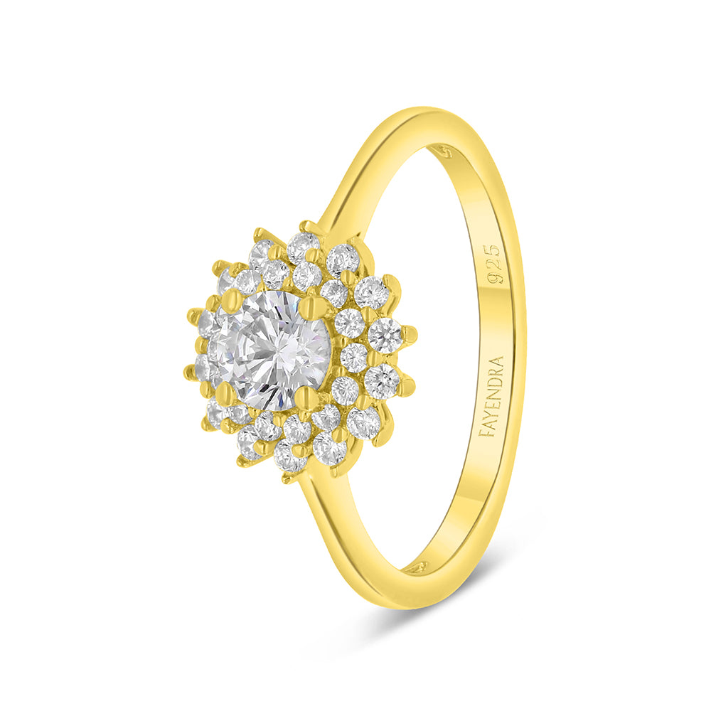 Total weight: 2.5gAn elegant 925 sterling silver ring plated in gold. Showcasing a brilliant stone as the centerpiece, this elegant design is embellished with a pavé around the stone, on the gallery. It will work wonders with anything you pair it with.