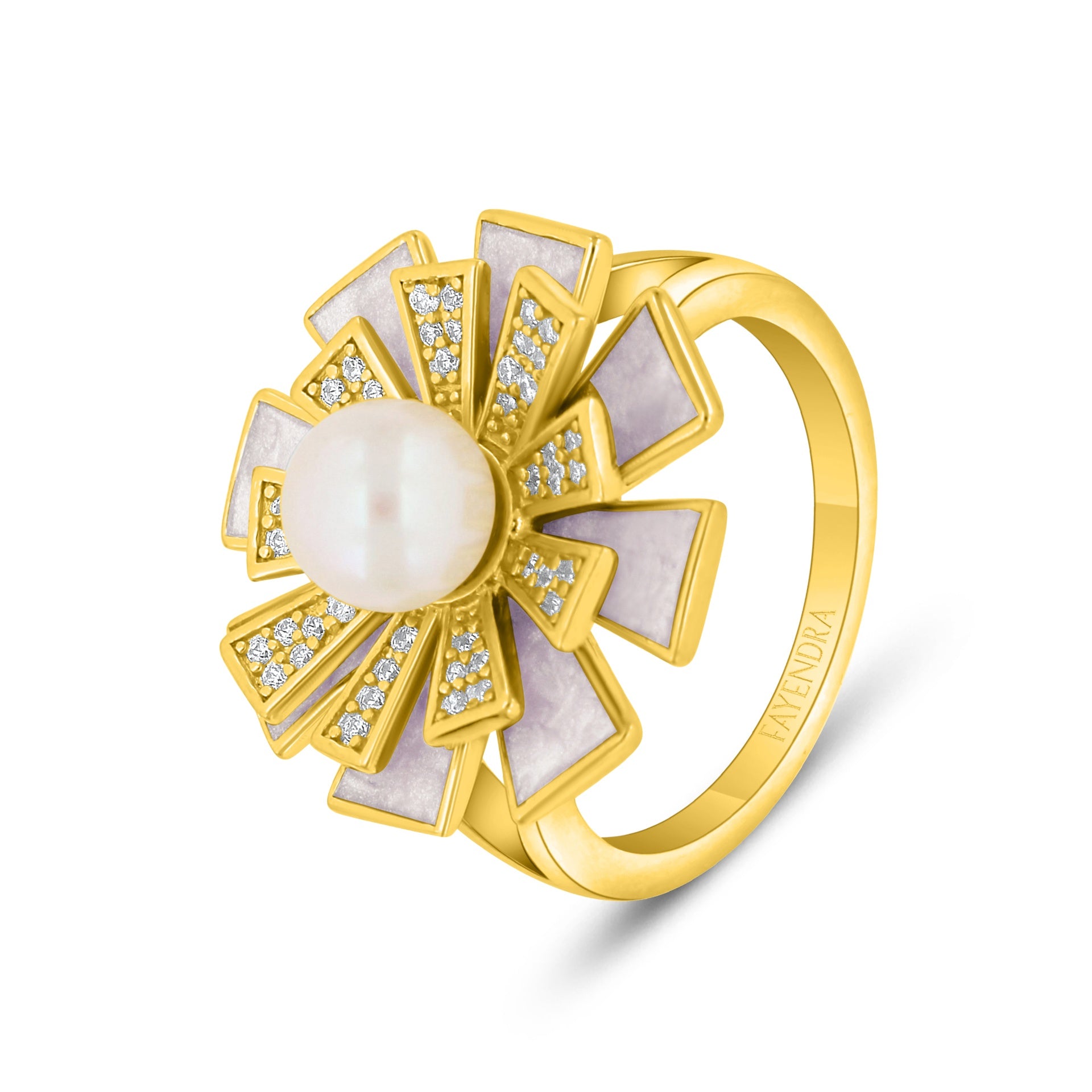Sterling Silver 925 Ring Golden Plated Embedded With Fresh Water Pearl And White Shell And White Zircon