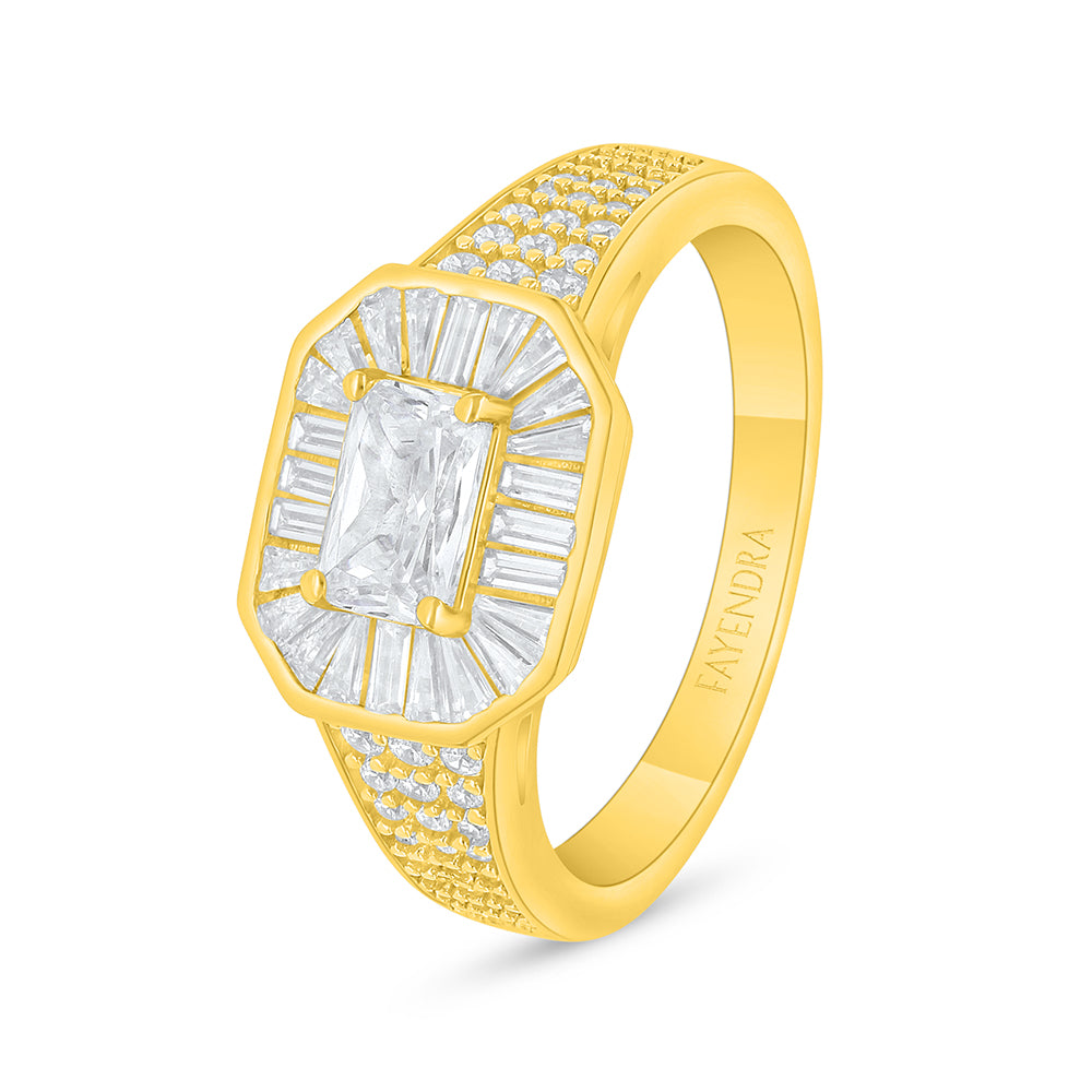 Total Weight :3.6gGive elegance a new meaning by wearing this stunning ring from Fayendra, featuring a multi-layered design made from pure 925 sterling silver,golden plated, and adorned with white zircon stones in varying sizes, cut in brilliant and baguette styles. At its center, sterling silver 925 Ring Rhodium Plated Embedded With a white zircon stone that adds extra sparkle. Wear it and illuminate your fingers with an unmatched shine that’s sure to catch the eye. Add it to your collection now!