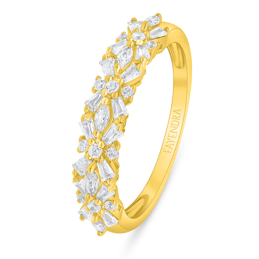 Total Weight: 1.8gRing from Fayendra crafted from pure 925 sterling silver plated with gold for a lasting radiant shine, featuring a stunning floral-inspired design adorned with sparkling white zircon stones where the cuts harmonize between baguette, marquise, and round brilliance to create a dazzling artistic composition that reflects femininity and luxury, a captivating feminine piece that suits you and completes your look with a unique touch of charm and beauty, get it now and elevate your collection with irresistible elegance!
