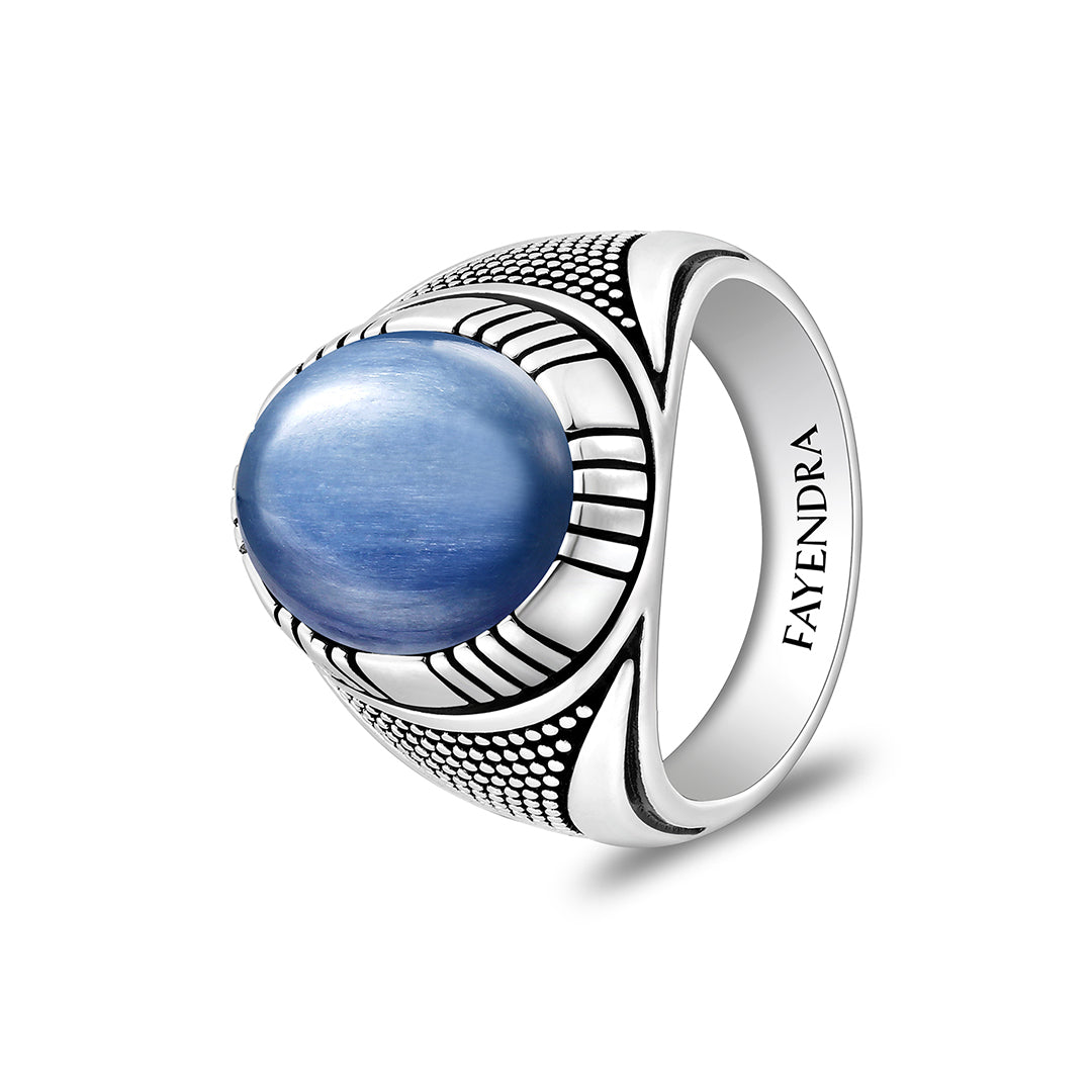 Sterling Silver 925 Ring Rhodium And Black Plated Embedded With Cabochon Natural Kyanite For Men