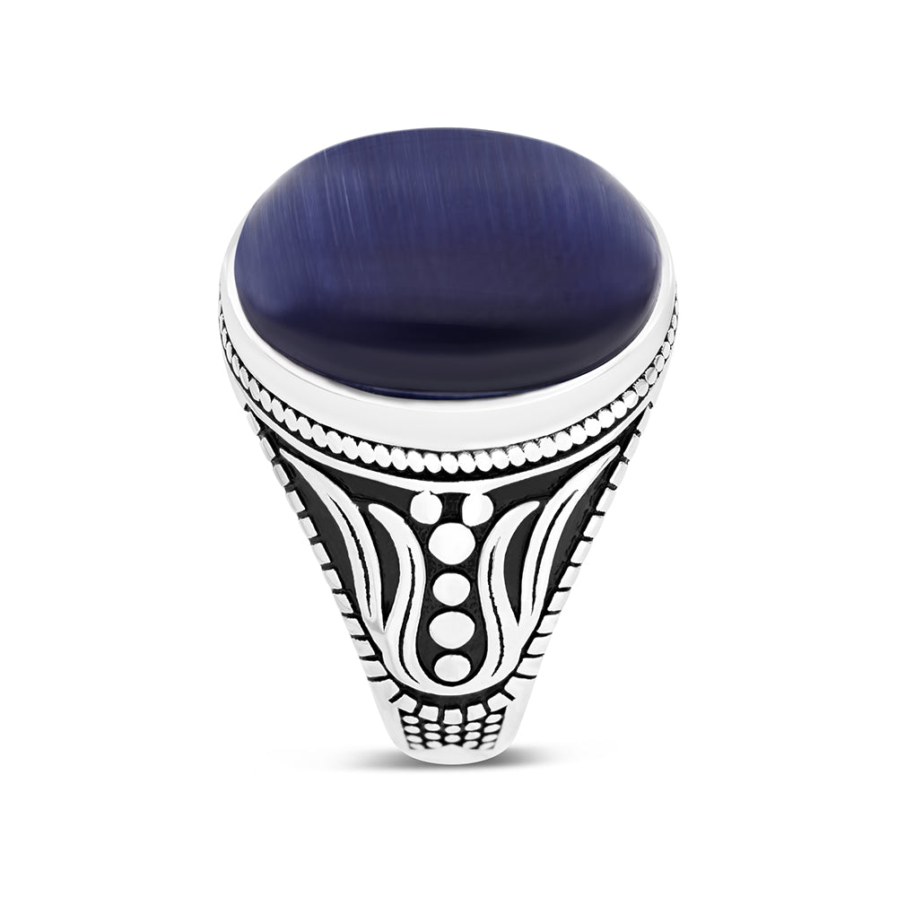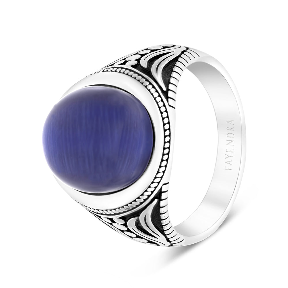 Sterling Silver 925 Ring Rhodium Plated Blue Tiger Eye For Men
