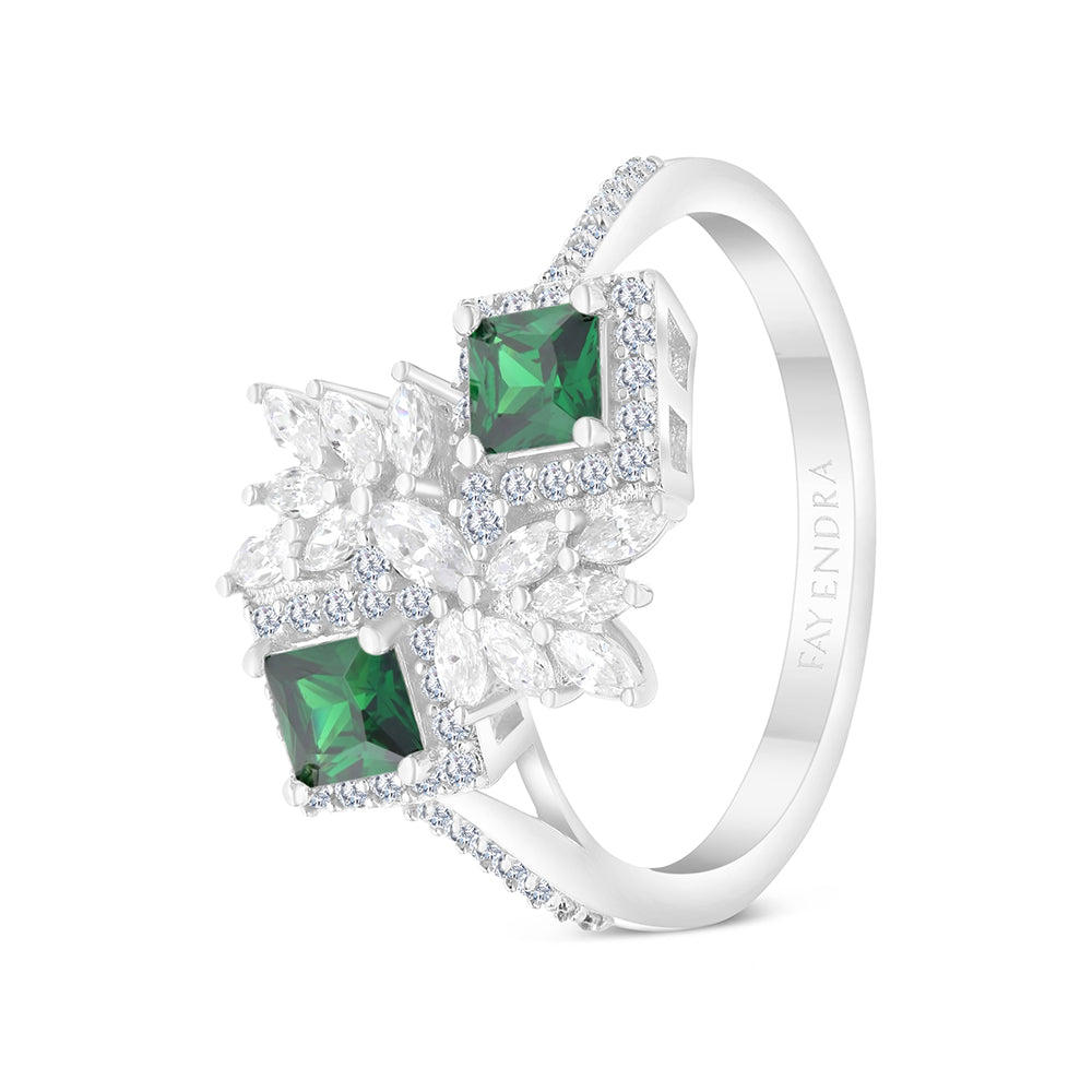 Sterling Silver 925 Ring Rhodium Plated Embedded With Emerald Zircon And White CZ