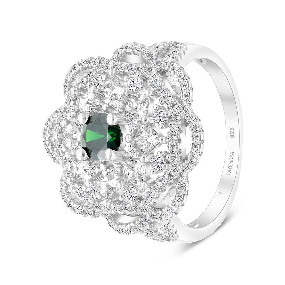 Sterling Silver 925 Ring Rhodium Plated Embedded With Emerald Zircon And White CZ