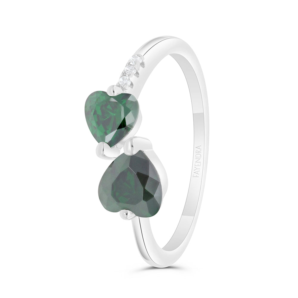 Total weigt: 2gExquisitely designed, this sterling silver ring is the epitome of understated elegance. Nestled gracefully upon its shimmering band are two heart-shaped emerald zircon stones, placed face to face. These twin hearts radiate with an unmatched sparkle, each facet capturing and refracting light with a dance that captivates the beholder. The luminous glow of the zircon contrasts beautifully with the cool luster of the silver, evoking a sense of harmonious balance. Whether it's a symbol of self-love, a treasured gift, or a representation of two souls intertwined, this ring seamlessly blends sophistication with sentiment, making it an unforgettable piece for any jewelry collection.
