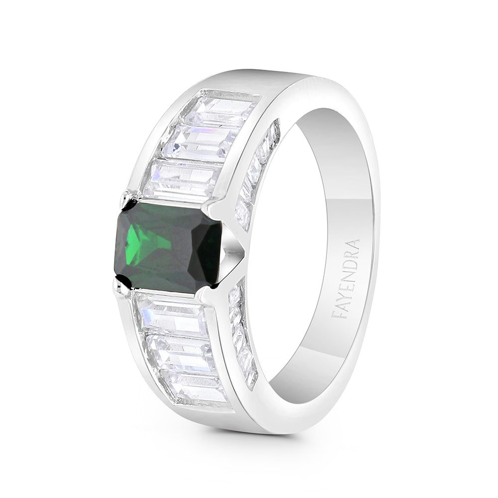 Total weight: 5.4gYou are the beauty and all its sweet details. And we, at Fayendra, craft the most beautiful jewelry to enhance what you already have. This ring is made of 925 sterling silver and is adorned with a central emerald zircon stone and white zircon stones tracing the metal.
