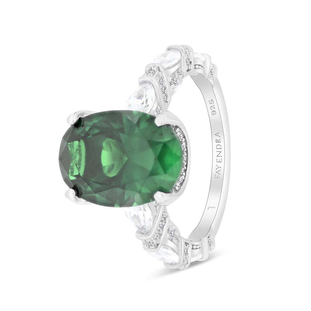 Sterling Silver 925 Ring Rhodium Plated Embedded With Emerald Zircon And White CZ