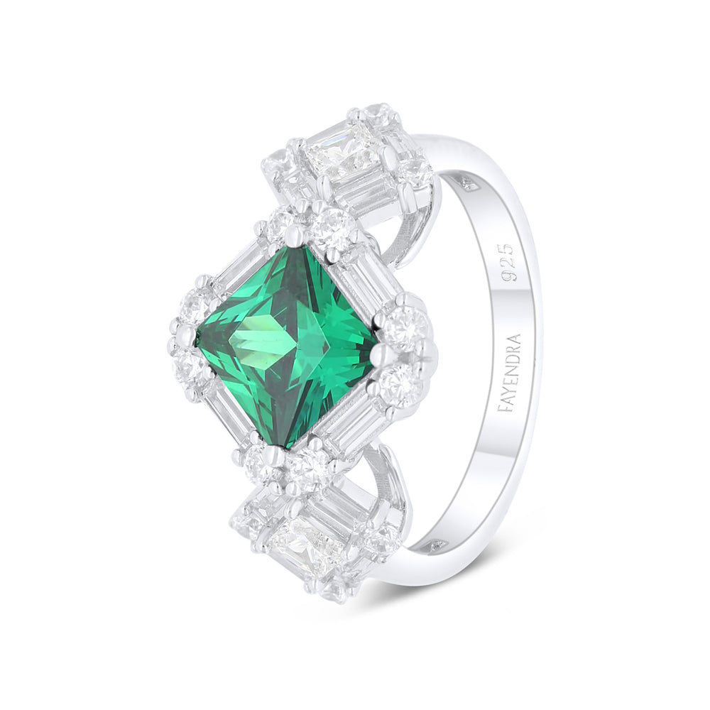 Sterling Silver 925 Ring Rhodium Plated Embedded With Emerald Zircon And White Zircon