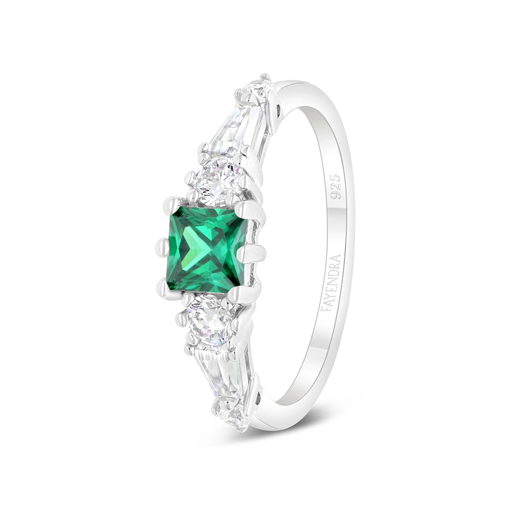 Total weight: 2.2gAn eye-catching ring created from fine sterling silver with a modern, stylish design. The ring is rhodium-plated, making it more durable and gleaming.A core emerald zircon stone sparkles with a lovely and appealing hue in the center of the ring. Small white zircon stones are brightly set next to it, simulating the shine of a magnificent diamond. These stones lend a sense of richness and refinement to the design, making it suitable for both special events and everyday use. Each stone is tightly and securely secured in place, assuring the ring's durability and long-lasting beauty.