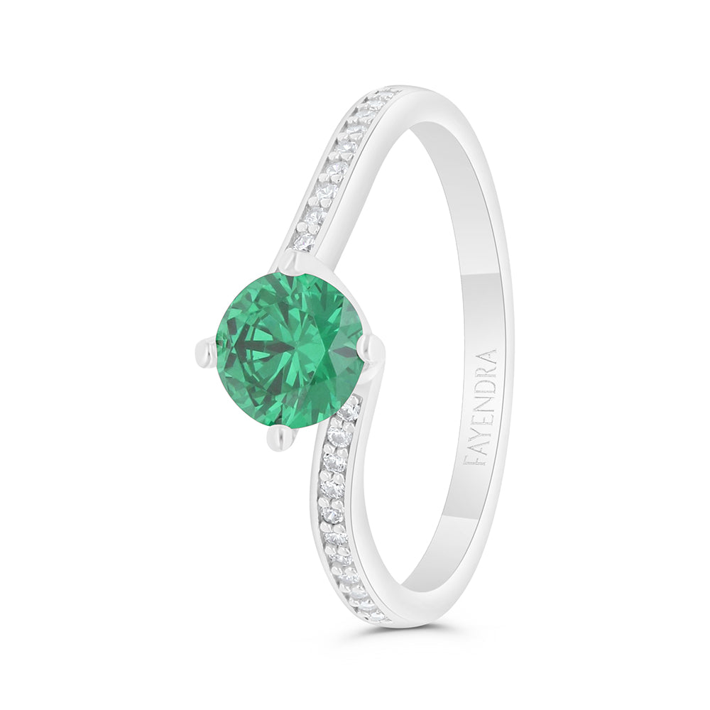 Total weight: 2.2gEnjoy unparalleled brilliance with this gorgeous and modern Fayendra solitaire ring. The ring features an elegant and luxurious design, as it includes a central emerald zircon stone that radiates a stunning sparkle and a stunning color that captivates the eye. It is studded with a sparkling pavement of sparkling white zircon stones that adorn the sides of the ring, giving it a final touch of luxury and brilliance. The ring is rhodium-plated for durability and shine.