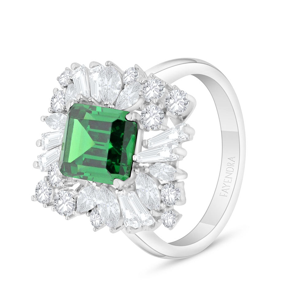 Sterling Silver 925 Ring Rhodium Plated Embedded With Emerald Zircon And White Zircon