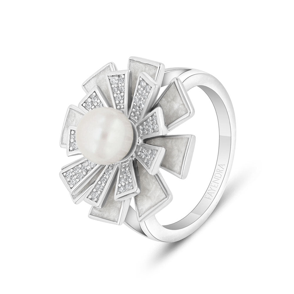 Sterling Silver 925 Ring Rhodium Plated Embedded With Fresh Water Pearl And White Shell And White Zircon