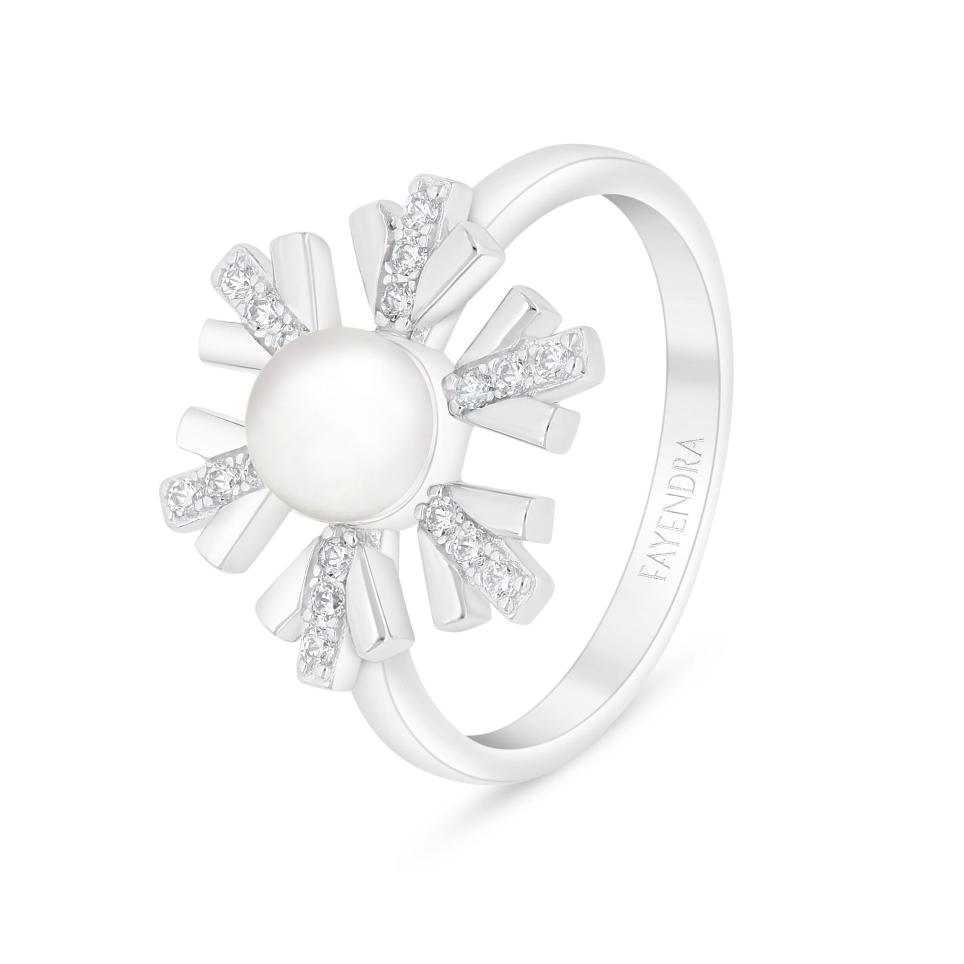 Total Weight: 3.2gAdd a touch of elegance and femininity to your look with this exquisite ring, crafted from pure 925 sterling silver and finished with a protective rhodium plating. Inspired by the delicate beauty of snowflakes, its edges are adorned with sparkling white zircon stones, gracefully surrounding a natural pearl at the center for a soft, charming finish. A perfect addition to your daily style. make it yours today!