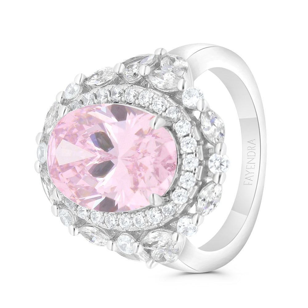 Total wright : 7.8gFeel elegant and luxurious with this glamourous 925 sterling silver ring, the rhodium-plated ring is crowned with pink zircon in an oval cut giving it a vibrant color, and is adorned with shiny white zircon stones sparkling dazzlingly.