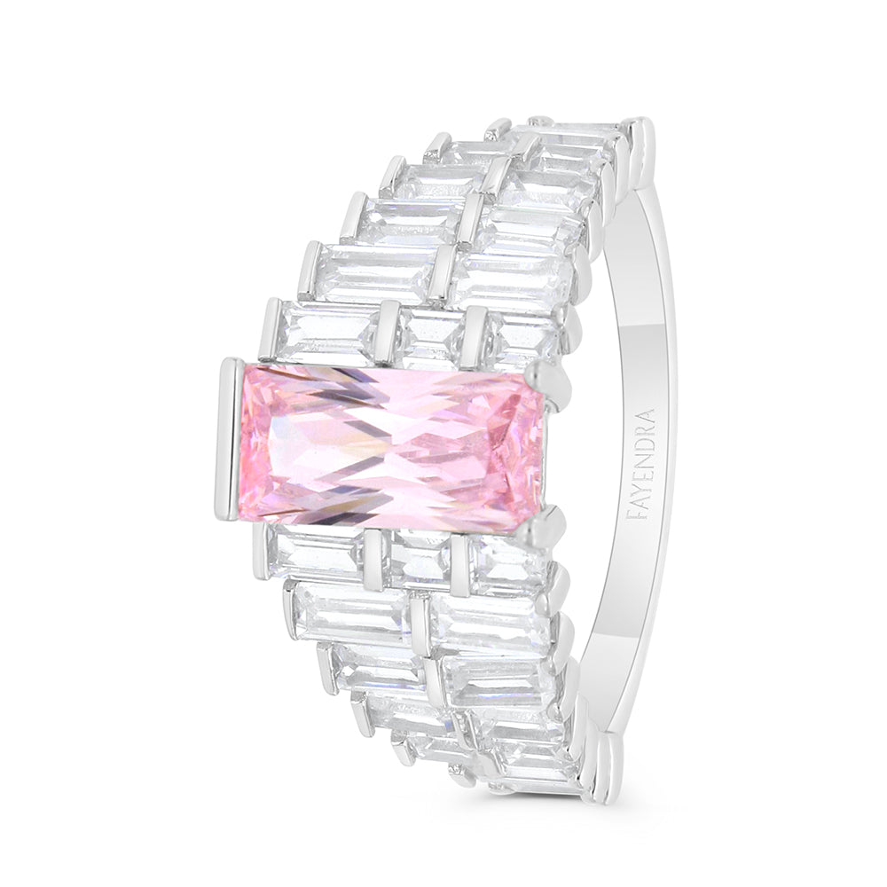 Total weight: 3.7gGlamorous 925 sterling silver ring, sparkling brilliantly, made of two stacked rows of white zircon stones with a central pink zircon in the middle, all in an emerald cut. The shiny ring is plated in rhodium for extra durability and luster.