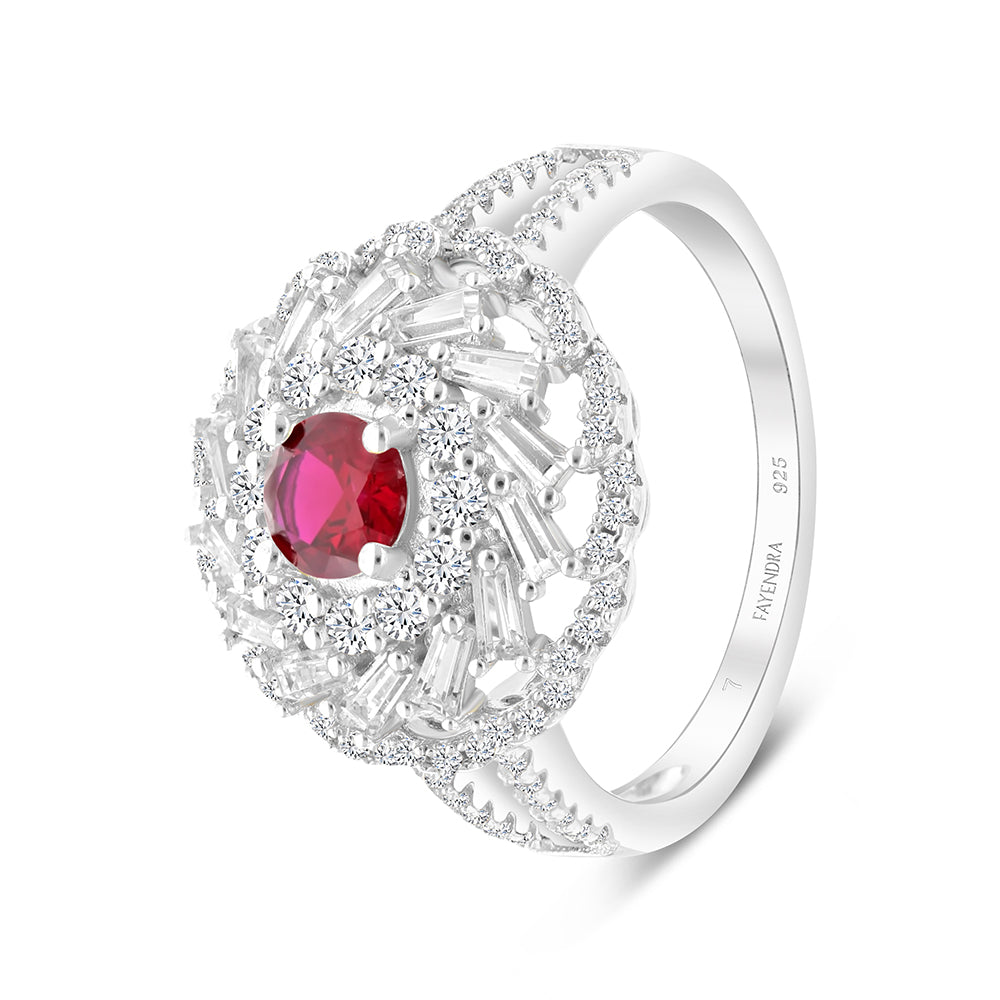 cubic zirconia surrounding a dazzling ruby corundum central stone in a