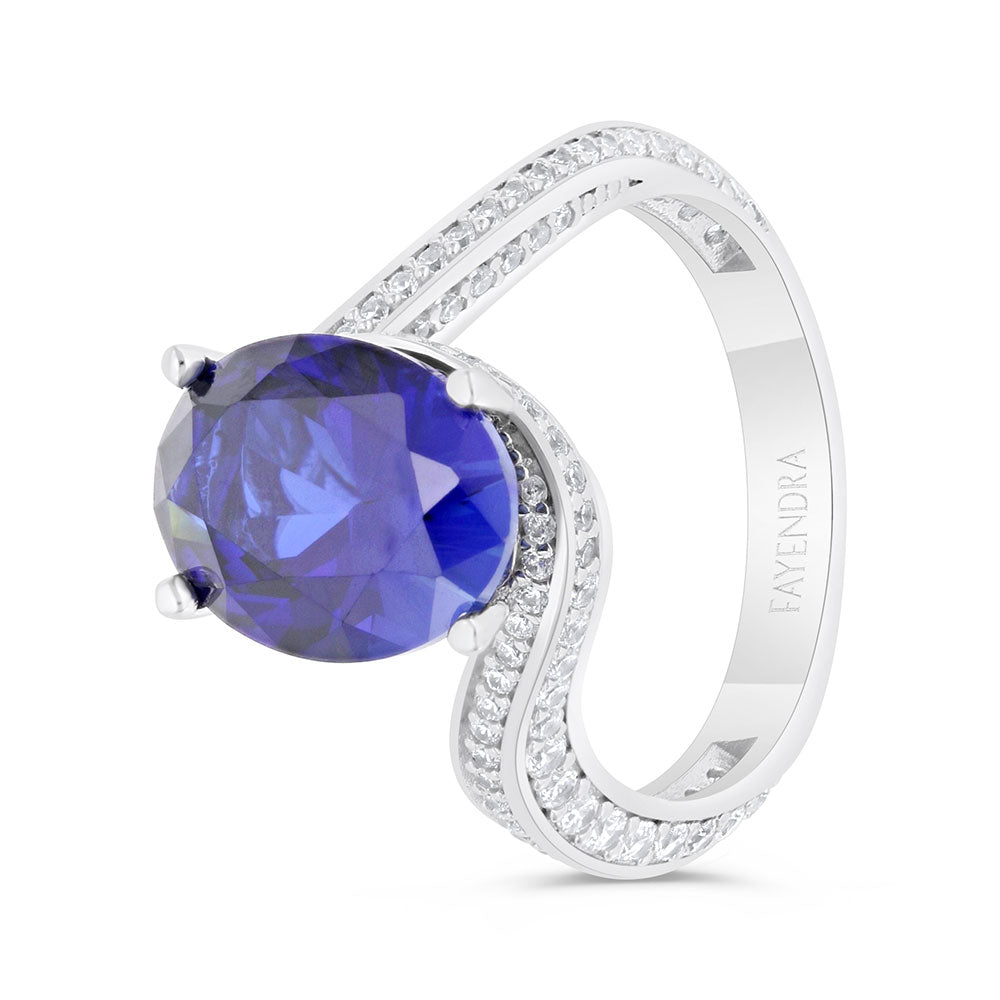 Total weight :5.7gFayendra's stunning contemporary silver ring is a timeless representation of refinement and innovation that redefines traditional beauty. with its appealing design. The rhodium-plated ring shines with a center oval-cut sapphire corundum stone and with white zircon pave.