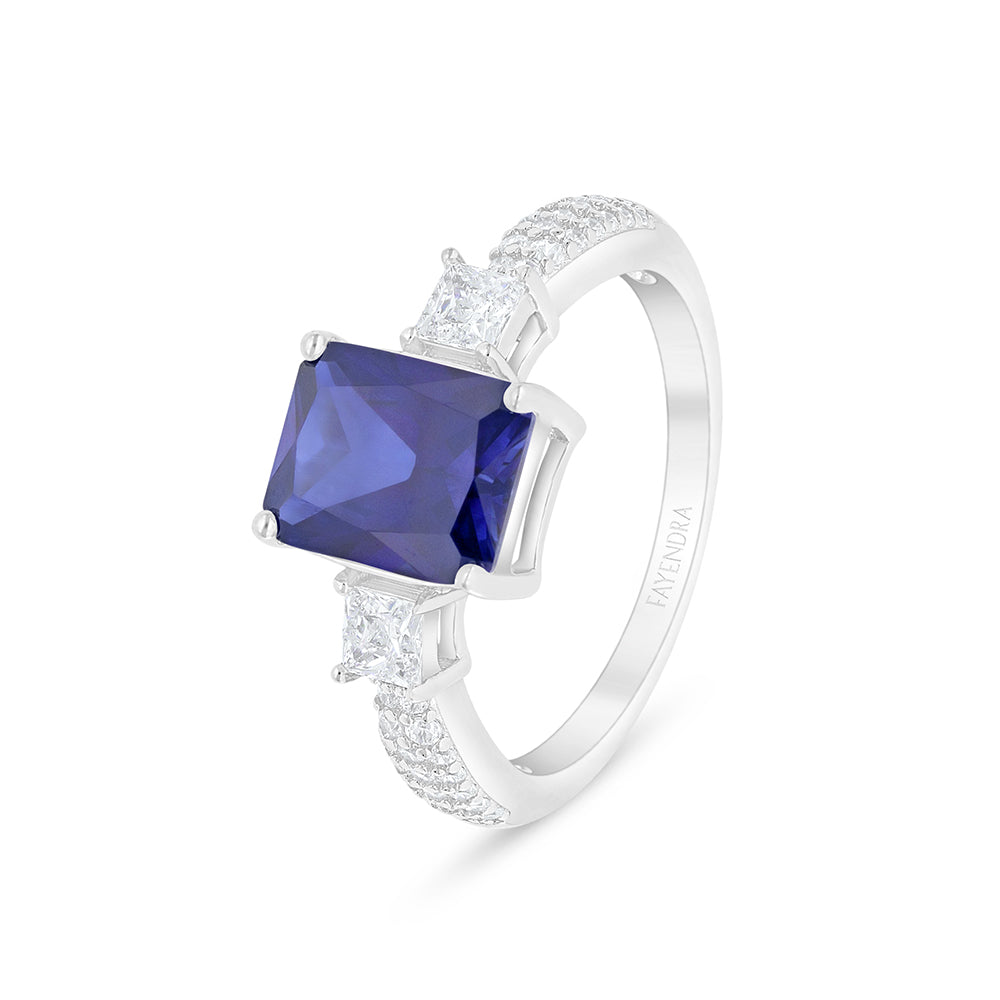Total Weight: 3.5gShine with exceptional allure wearing this luxurious Fayendra ring, featuring an elegant design crafted from pure 925 sterling silver, coated with a protective layer of radiant rhodium. The ring is adorned with meticulously set rows of sparkling white zircon stones, crowned at the center by a premium sapphire curundum cushion-cut gemstone that adds a touch of distinction and sophistication to your look. A piece that perfects your elegance with eye-catching details. Get yours now!