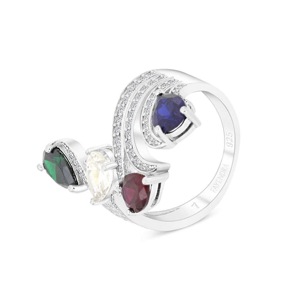 Sterling Silver 925 Ring Rhodium Plated Embedded With Sapphire Corundum , Ruby Corundum , Emerald Zircon And White CZ