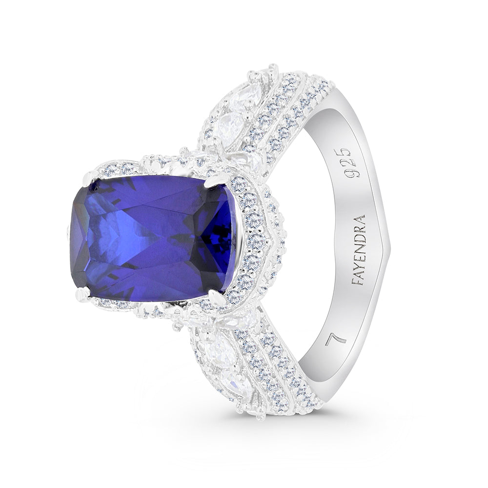 Sterling Silver 925 Ring Rhodium Plated Embedded With Sapphire CorundumAnd White CZ
