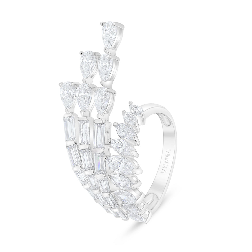 Total Weight: 5.5gA Fayendra ring crafted from pure 925 sterling silver, luxuriously plated with rhodium to ensure a lasting and captivating shine. The unique design is adorned with a majestic cascade of sparkling white zircon stones; marquise-cut gems with their refined silhouette, teardrop-cut stones with their soft radiance, and baguette-cut stones with their geometric brilliance come together in a rising harmony that exudes feminine allure and exceptional elegance. A bold and graceful piece made to highlight your distinctive presence on every occasion!