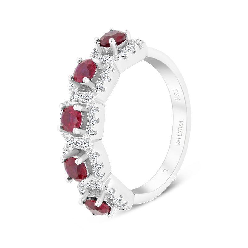 Blazing red rubies illuminate the sterling silver metal