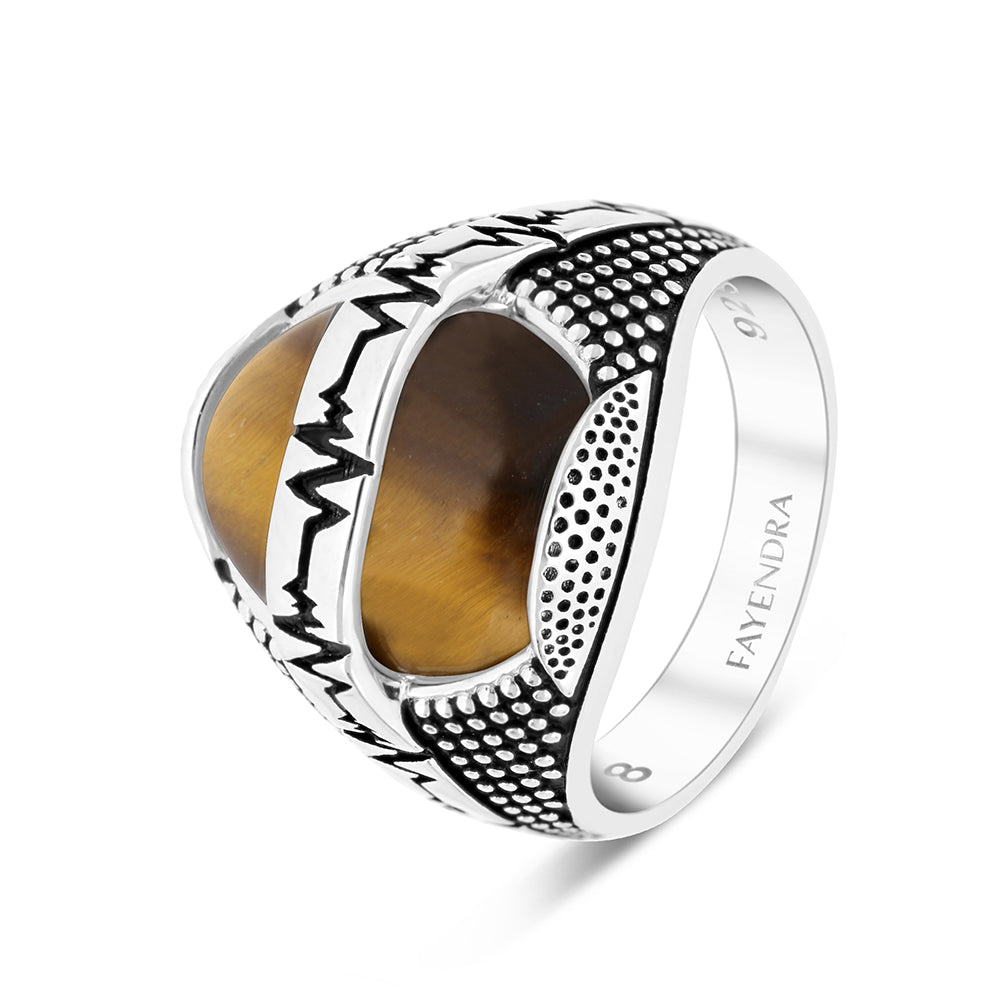 Sterling Silver 925 Ring Rhodium Plated Yellow Tiger Eye For Men