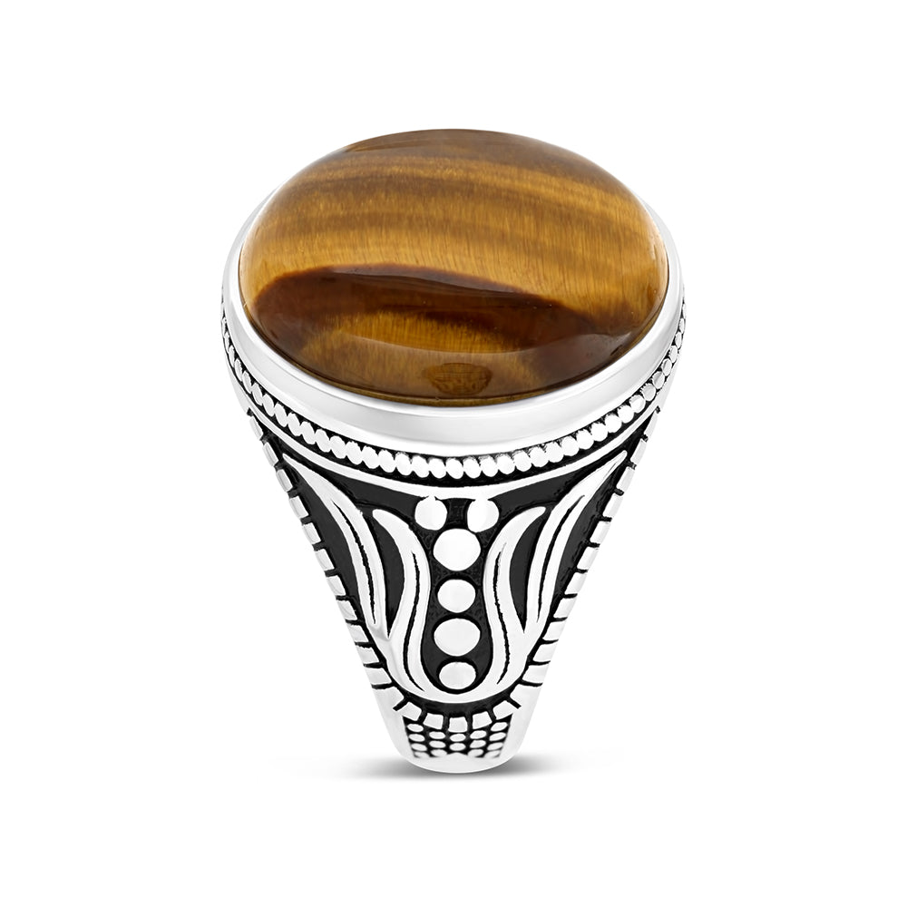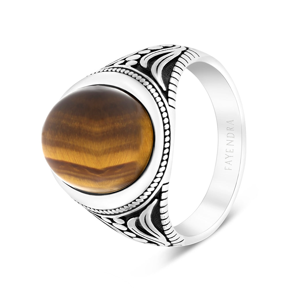 Sterling Silver 925 Ring Rhodium Plated Yellow Tiger Eye For Men