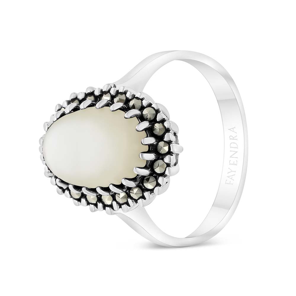 خاتم فضة إسترليني من مجموعتنا الكلاسيكية ، مصمم ليعكس الأناقة الجليلة .يزين الخاتم الكلاسيكي حجر صدفة بيضاء طبيعية مؤطر بالماركاسيت اللامع. قطعة مميزة لسيدة وقورة.